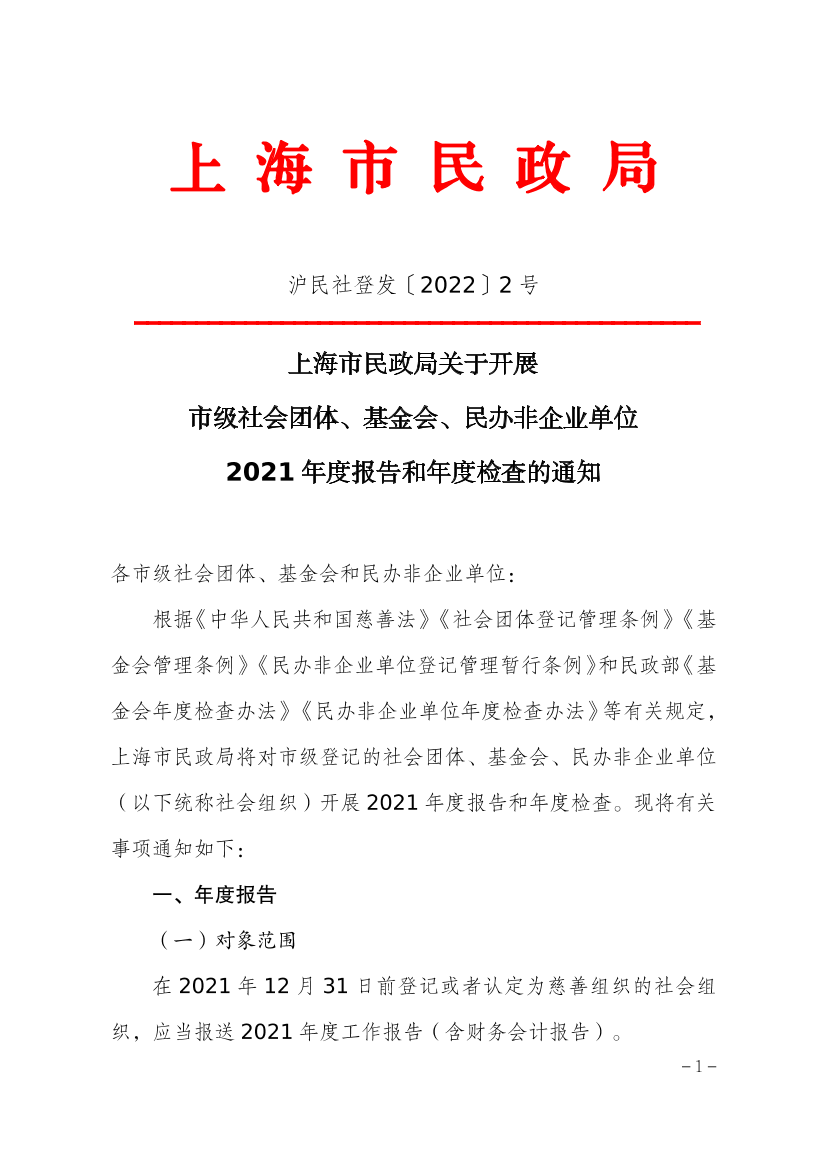 根据《中华人民共和国慈善法》《社会团体登记管理条例》《基金会管理条例》《民办非企业单位登记管理暂行条例》和民政部《基金会年度检查办法》《民办非企业单位年度检查办法》等有关规定,上海市民政局将对市级登记的社会团体、基金会、民办非企业单位(以下统称社会组织)开展2021年度报告和年度检查。现将有关事项通知如下: