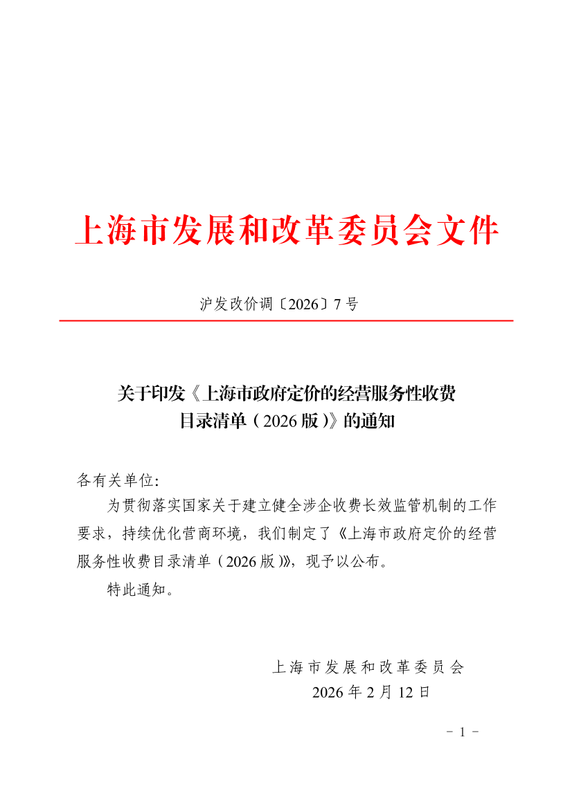 为贯彻落实国家关于建立健全涉企收费长效监管机制的工作要求,持续优化营商环境,我们制定了《上海市政府定价的经营服务性收费目录清单(2026版)》,现予以公布。