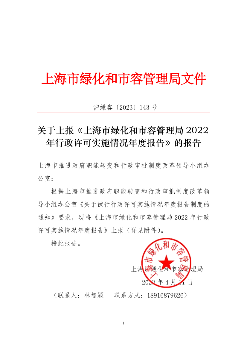 根据上海市推进政府职能转变和行政审批制度改革领导小组办公室《关于试行行政许可实施情况年度报告制度的通知》要求,现将《上海市绿化和市容管理局2022年行政许可实施情况年度报告》上报(详见附件)。