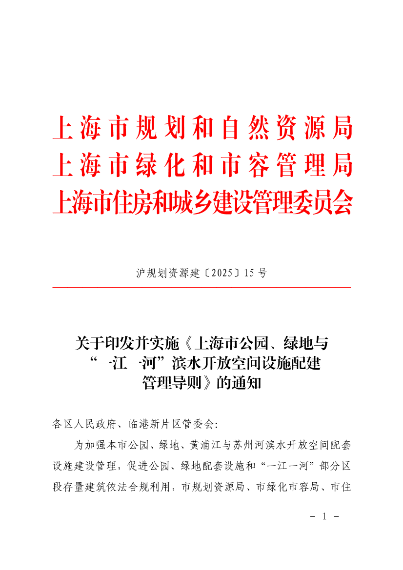 关于印发并实施《上海市公园、绿地与“一江一河”滨水开放空间设施配建管理导则》的通知