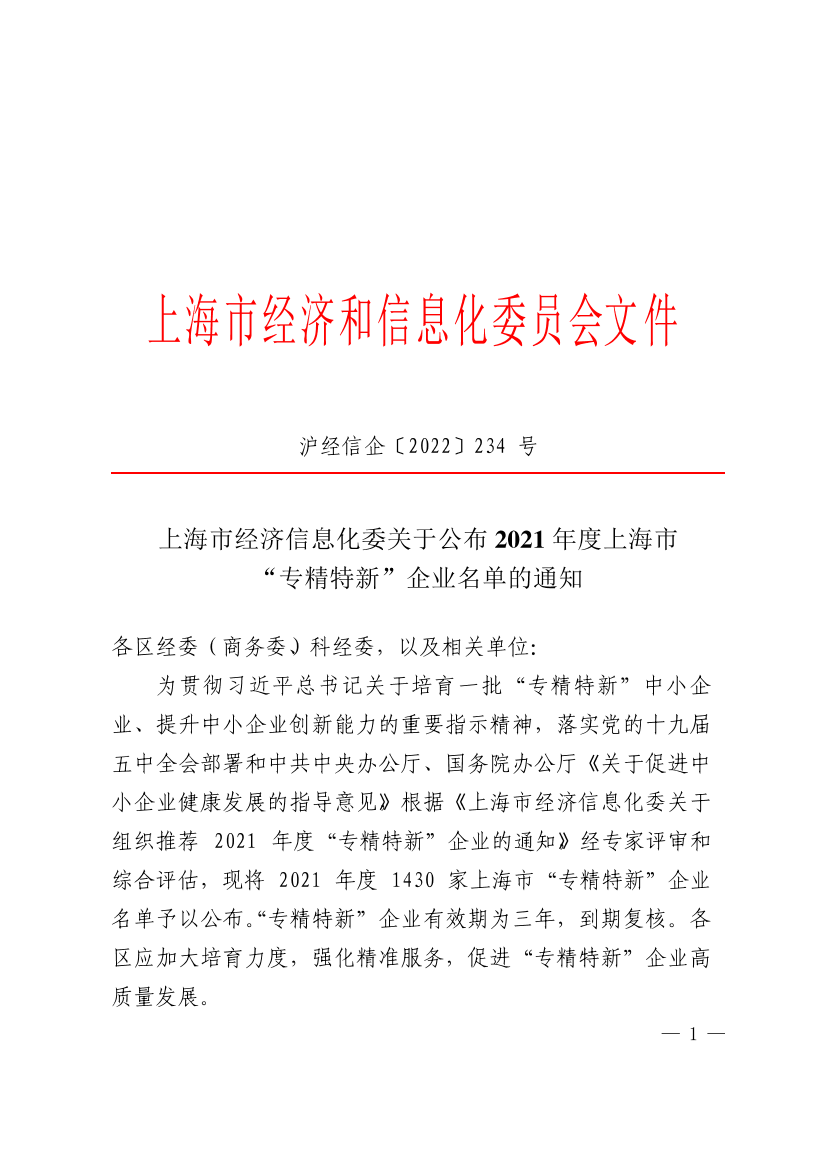 为贯彻习近平总书记关于培育一批“专精特新”中小企业、提升中小企业创新能力的重要指示精神,落实党的十九届五中全会部署和中共中央办公厅、国务院办公厅《关于促进中小企业健康发展的指导意见》,根据《上海市经济信息化委关于组织推荐2021年度“专精特新”企业的通知》,经专家评审和综合评估,现将2021年度1430家上海市“专精特新”企业名单予以公布。“专精特新”企业有效期为三年,到期复核。各区应加大培育力度,强化精准服务,促进“专精特新”企业高质量发展。