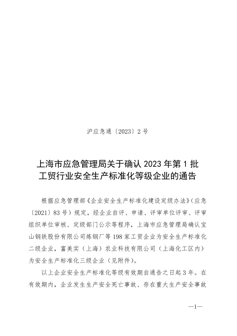 根据应急管理部《企业安全生产标准化建设定级办法》(应急〔2021〕83号)规定,经企业自评、申请、评审单位评审、评审组织单位审核、定级部门公示等程序,上海市应急管理局确认宝山钢铁股份有限公司炼钢厂等198家工贸企业为安全生产标准化二级企业,富美实(上海)农业科技有限公司(上海化工区内)为安全生产标准化三级企业(见附件)。
