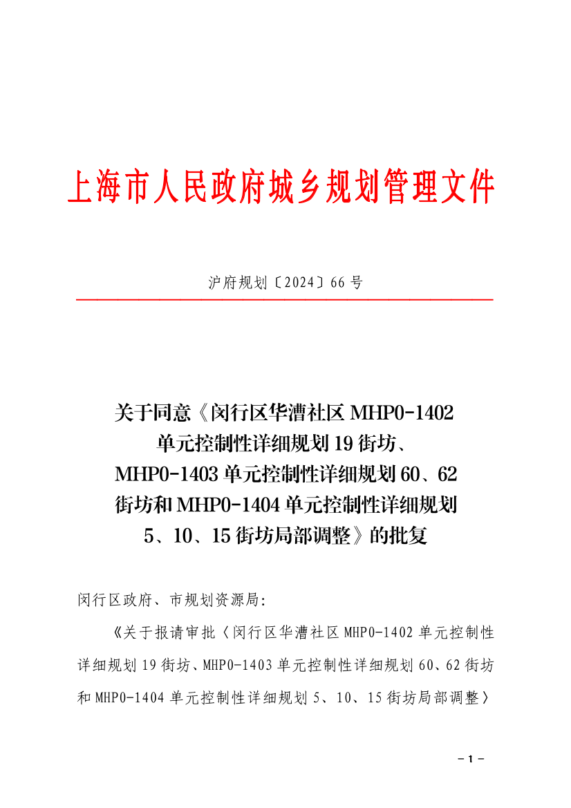 《关于报请审批〈闵行区华漕社区MHP0-1402单元控制性详细规划19街坊、MHP0-1403单元控制性详细规划60、62街坊和MHP0-1404单元控制性详细规划5、10、15街坊局部调整〉的请示》(沪闵府规〔2024〕7号)收悉。经研究,原则同意上报规划内容。