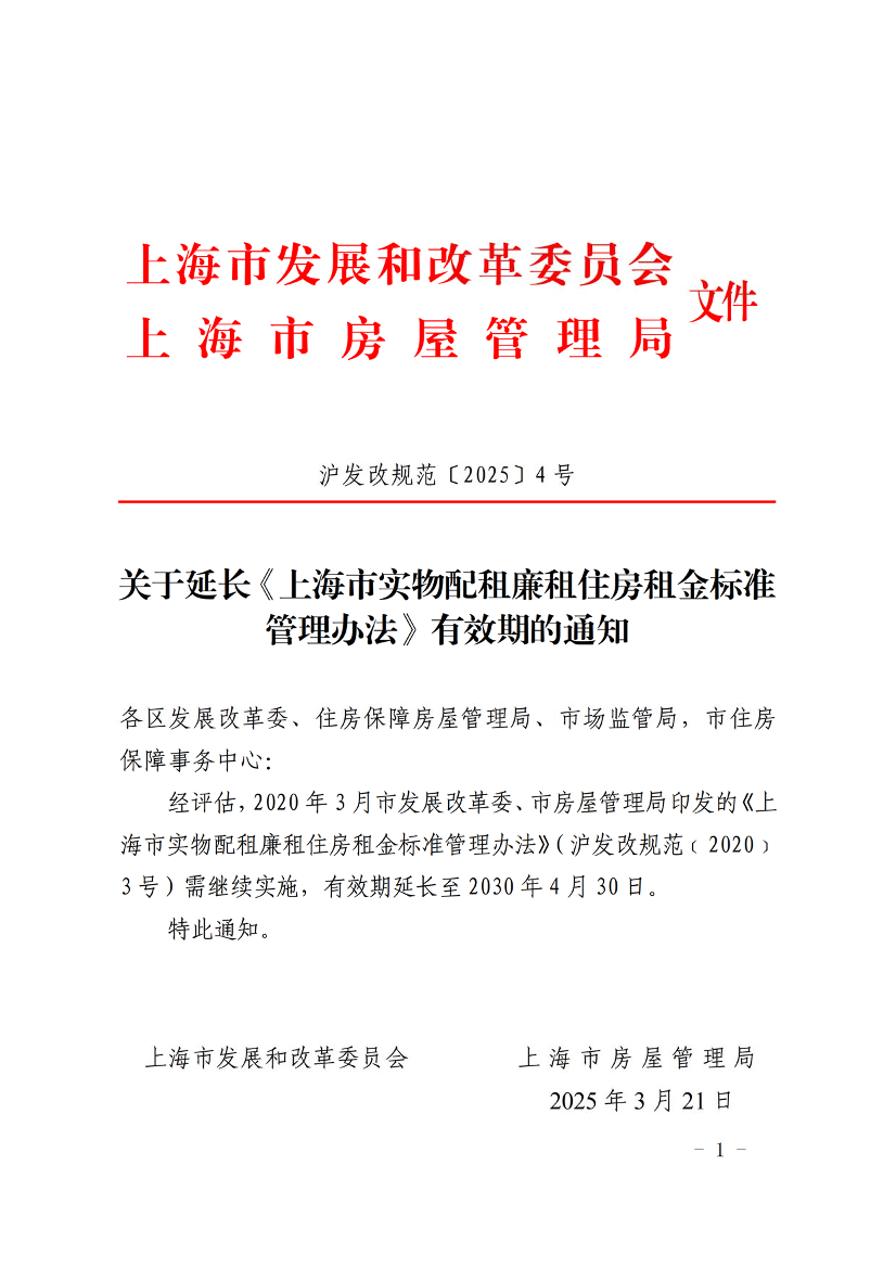 经评估,2020年3月市发展改革委、市房屋管理局印发的《上海市实物配租廉租住房租金标准管理办法》(沪发改规范﹝2020﹞3号)需继续实施,有效期延长至2030年4月30日。