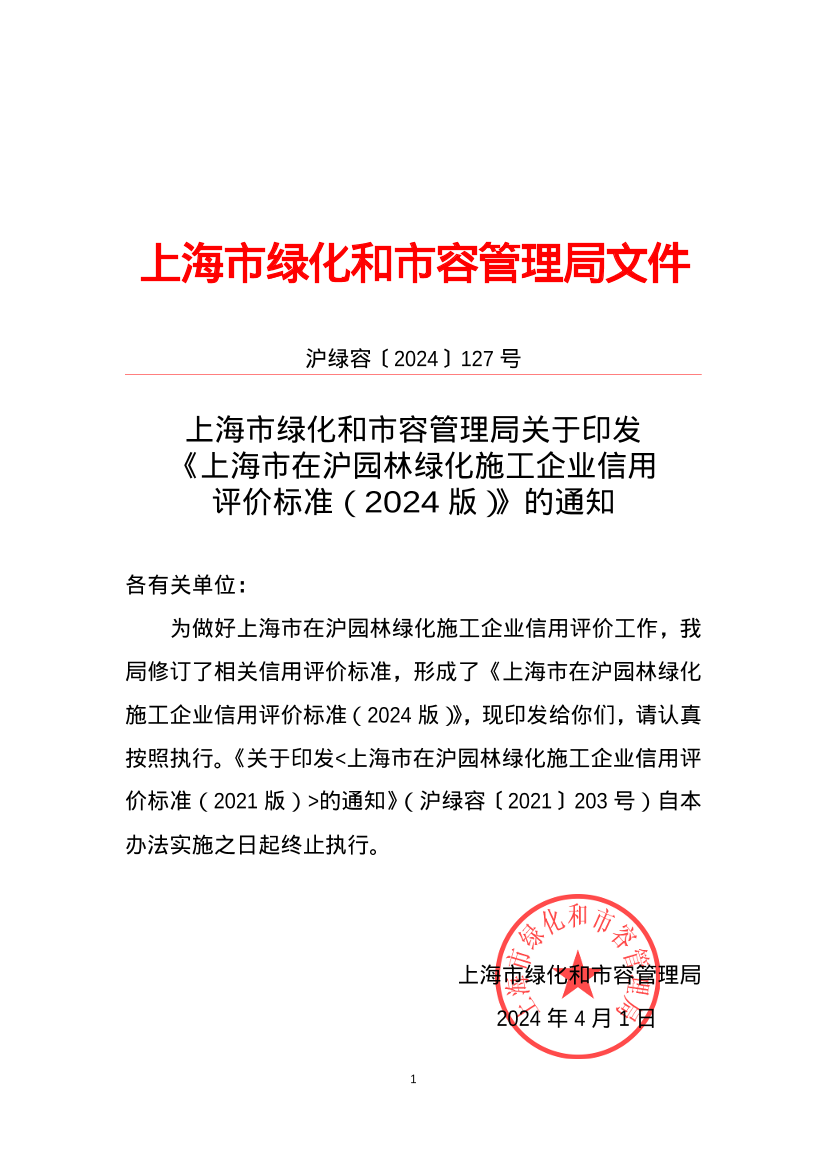 为做好上海市在沪园林绿化施工企业信用评价工作,我局修订了相关信用评价标准,形成了《上海市在沪园林绿化施工企业信用评价标准(2024版)》,现印发给你们,请认真按照执行。《关于印发<上海市在沪园林绿化施工企业信用评价标准(2021版)>的通知》(沪绿容〔2021〕203号)自本办法实施之日起终止执行。