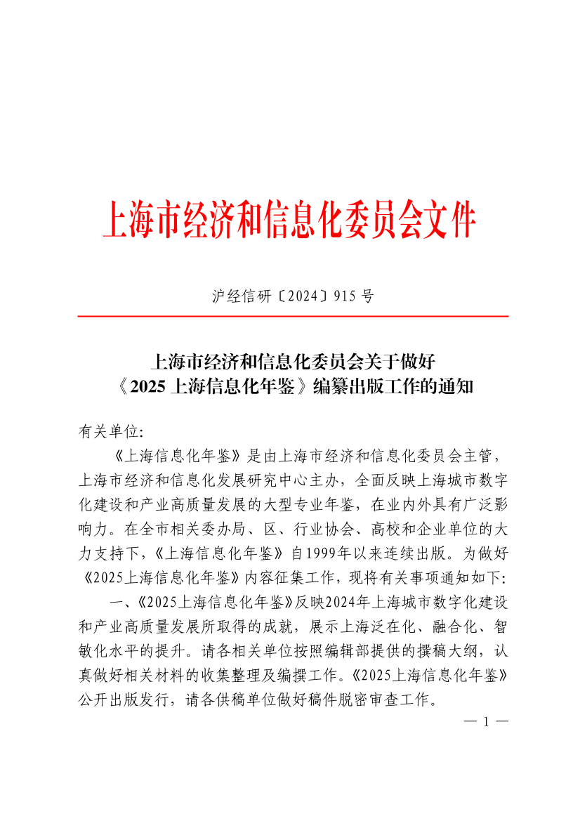 一、《2025上海信息化年鉴》反映2024年上海城市数字化建设和产业高质量发展所取得的成就,展示上海泛在化、融合化、智敏化水平的提升。请各相关单位按照编辑部提供的撰稿大纲,认真做好相关材料的收集整理及编撰工作。《2025上海信息化年鉴》公开出版发行,请各供稿单位做好稿件脱密审查工作。