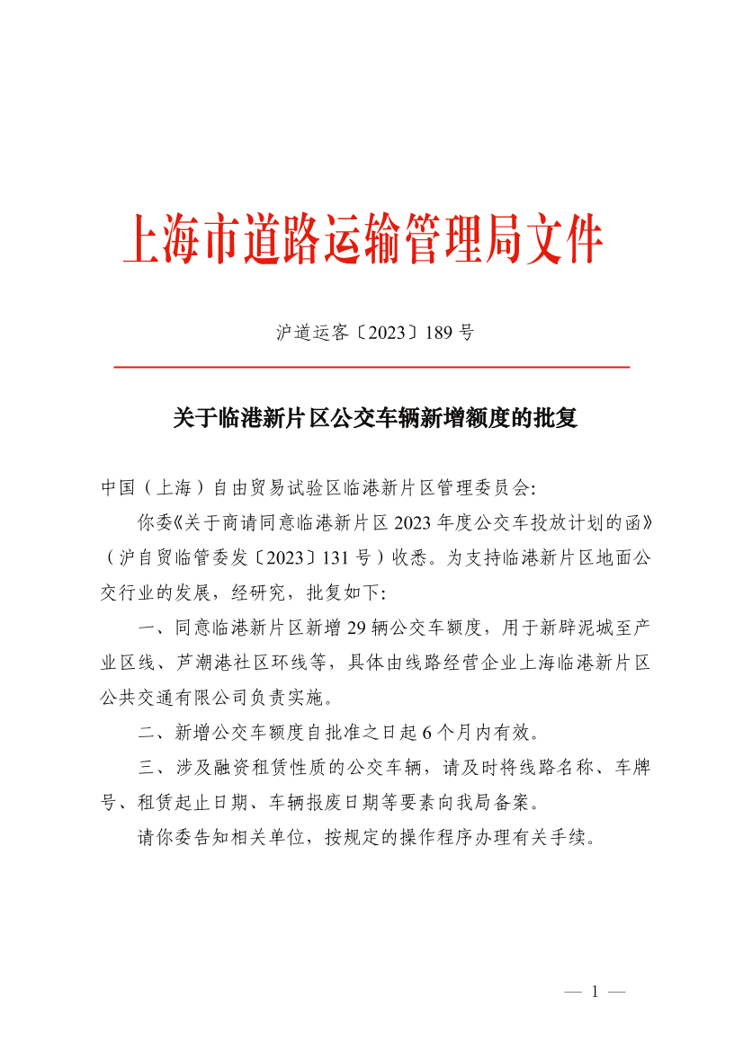 你委《关于商请同意临港新片区2023年度公交车投放计划的函》(沪自贸临管委发〔2023〕131号)收悉。为支持临港新片区地面公交行业的发展,经研究,批复如下: