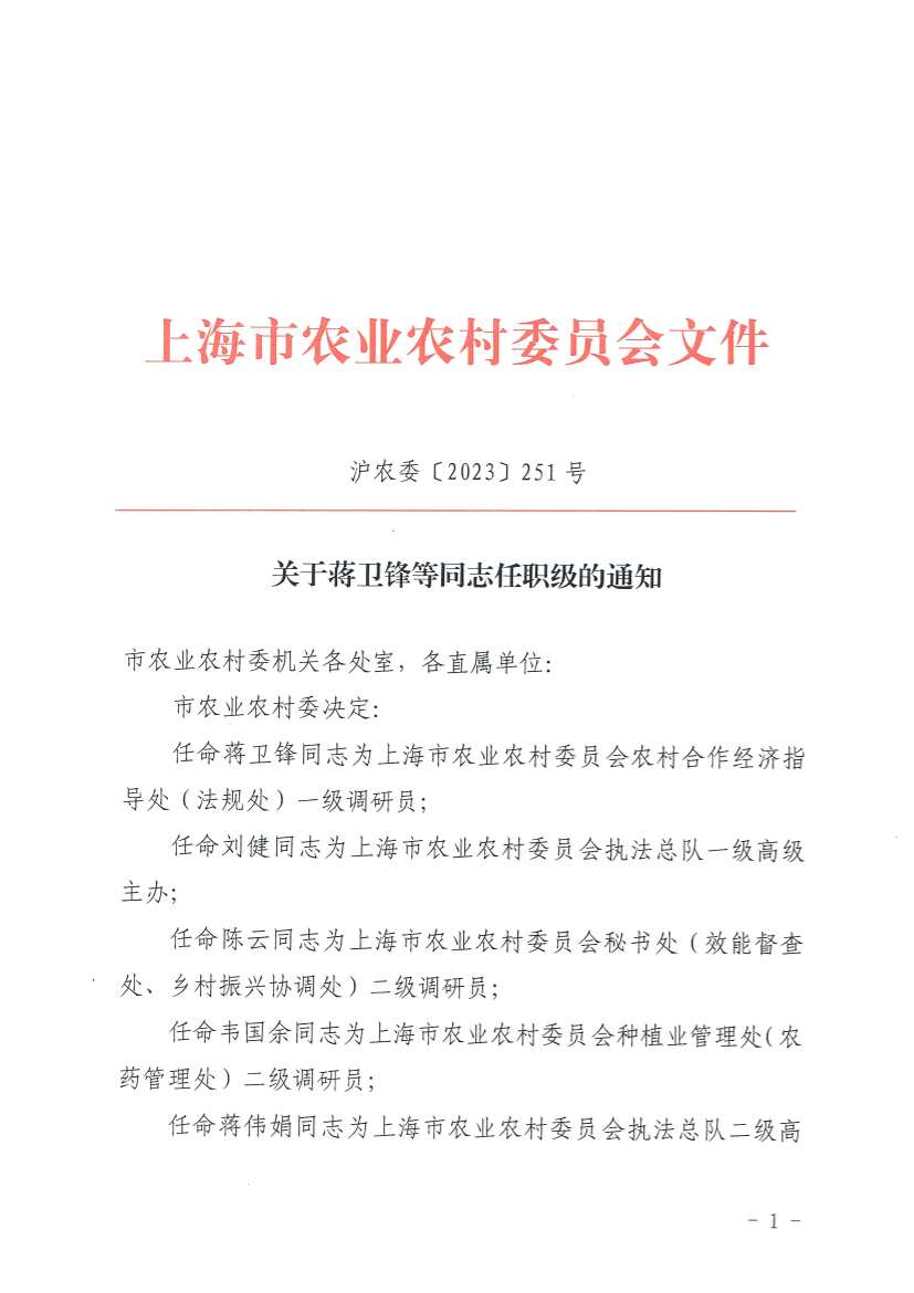 任命蒋卫锋同志为上海市农业农村委员会农村合作经济指导处(法规处)一级调研员;