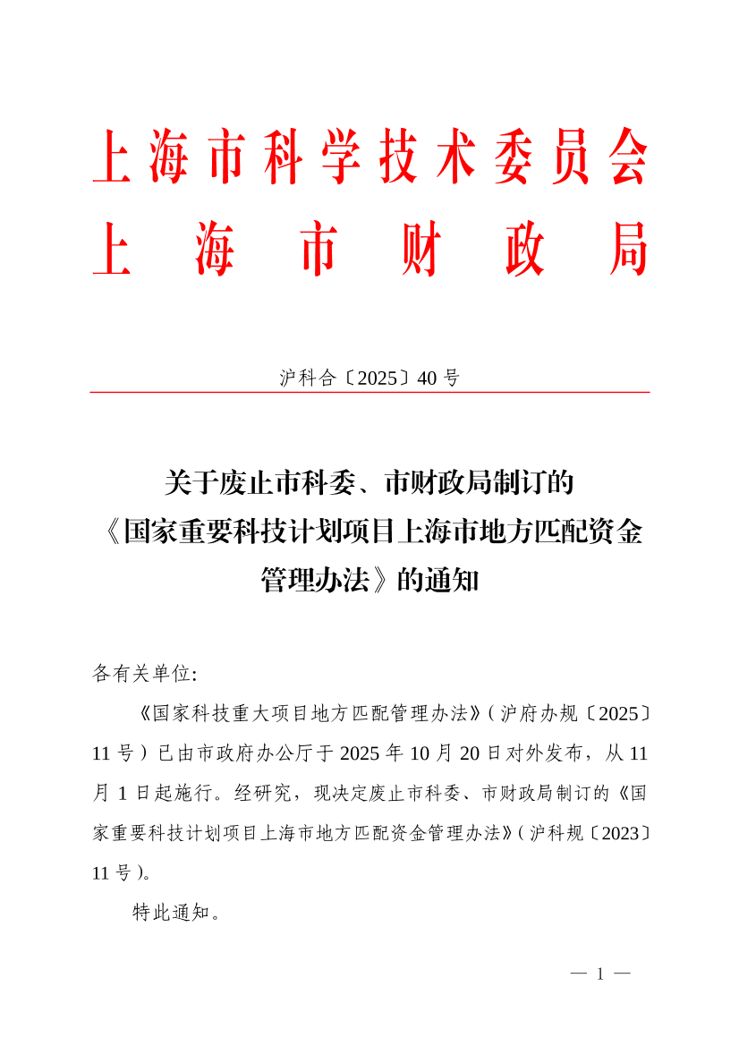 《国家科技重大项目地方匹配管理办法》(沪府办规〔2025〕11号)已由市政府办公厅于2025年10月20日对外发布,从11月1日起施行。经研究,现决定废止市科委、市财政局制订的《国家重要科技计划项目上海市地方匹配资金管理办法》(沪科规〔2023〕11号)。