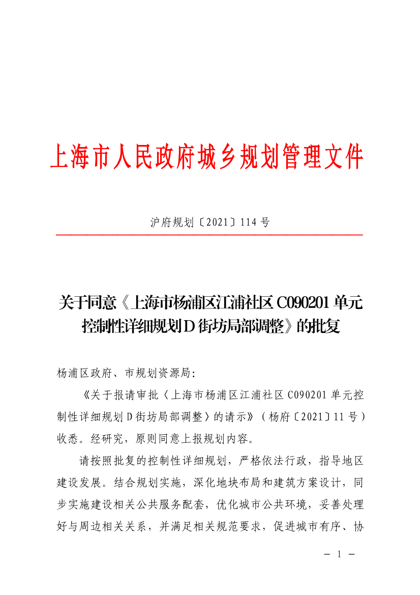 《关于报请审批〈上海市杨浦区江浦社区C090201单元控制性详细规划D街坊局部调整〉的请示》(杨府〔2021〕11号)收悉。经研究,原则同意上报规划内容。