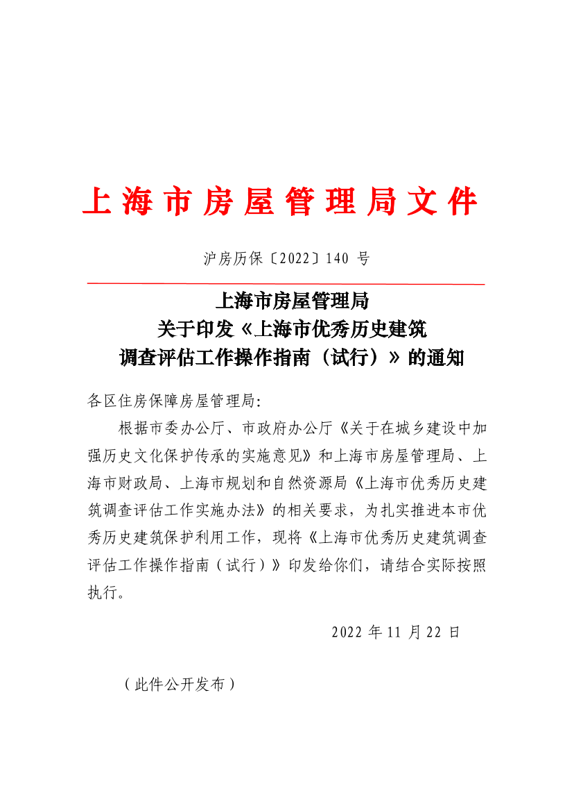 上海市房屋管理局 关于印发《上海市优秀历史建筑调查评估工作操作指南(试行)》的通知