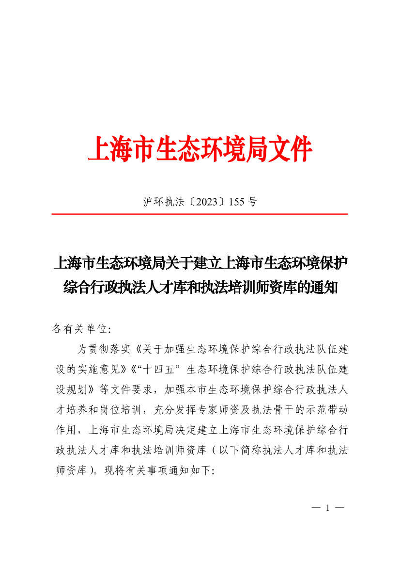 印发《关于建立上海市生态环境保护综合行政执法人才库和执法培训师资库的通知》,并主动公开。