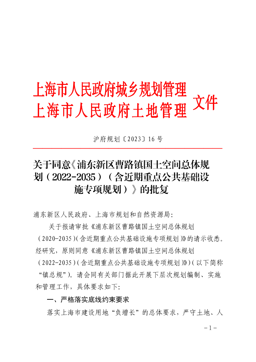 关于报请审批《浦东新区曹路镇国土空间总体规划(2020-2035)(含近期重点公共基础设施专项规划)》的请示收悉。经研究,原则同意《浦东新区曹路镇国土空间总体规划(2022-2035)(含近期重点公共基础设施专项规划)》)(以下简称“镇总规”)。请会同有关部门据此开展下层次规划编制、实施和管理工作,具体要求如下: