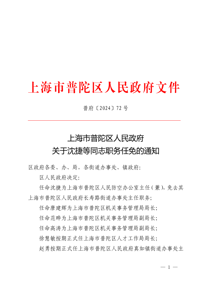 任命沈捷为上海市普陀区人民防空办公室主任(兼),免去其上海市普陀区人民政府长寿路街道办事处主任职务;