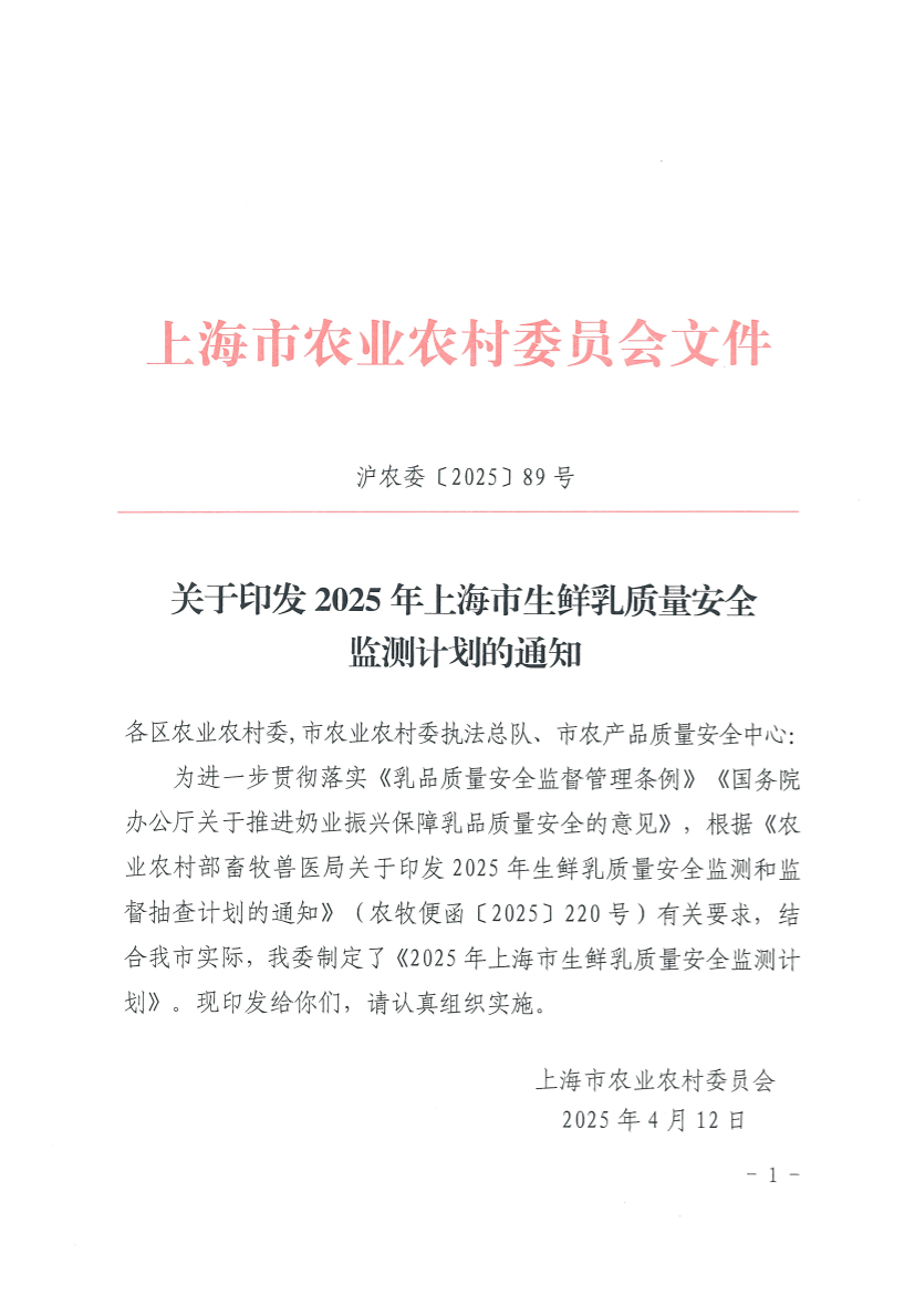为进一步贯彻落实《乳品质量安全监督管理条例》《国务院办公厅关于推进奶业振兴保障乳品质量安全的意见》,根据《农业农村部畜牧兽医局关于印发2025年生鲜乳质量安全监测和监督抽查计划的通知》(农牧便函〔2025〕220号)有关要求,结合我市实际,我委制定了《2025年上海市生鲜乳质量安全监测计划》。现印发给你们,请认真组织实施。