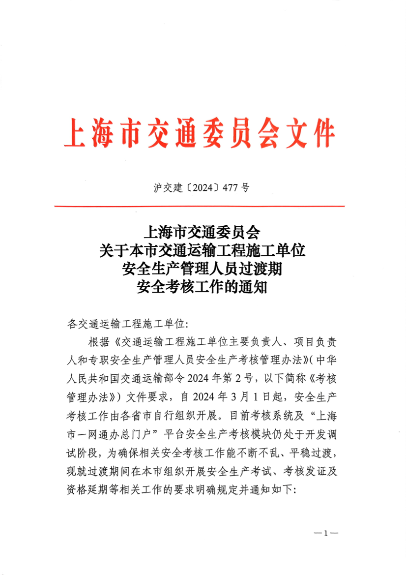 根据《交通运输工程施工单位主要负责人、项目负责人和专职安全生产管理人员安全生产考核管理办法》(中华人民共和国交通运输部令2024年第2号,以下简称《考核管理办法》)文件要求,自2024年3月1日起,安全生产考核工作由各省市自行组织开展。目前考核系统及“上海市一网通办总门户”平台安全生产考核模块仍处于开发调试阶段,为确保相关安全考核工作能不断不乱、平稳过渡,现就过渡期间在本市组织开展安全生产考试、考核发证及资格延期等相关工作的要求明确规定并通知如下: