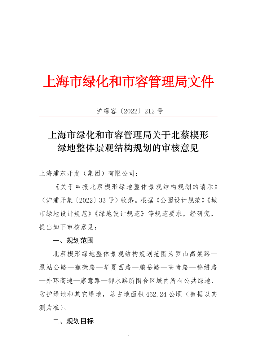 《关于申报北蔡楔形绿地整体景观结构规划的请示》(沪浦开集〔2022〕33号)收悉。根据《公园设计规范》《城市绿地设计规范》《绿地设计规范》等规范要求,经研究,提出如下审核意见: