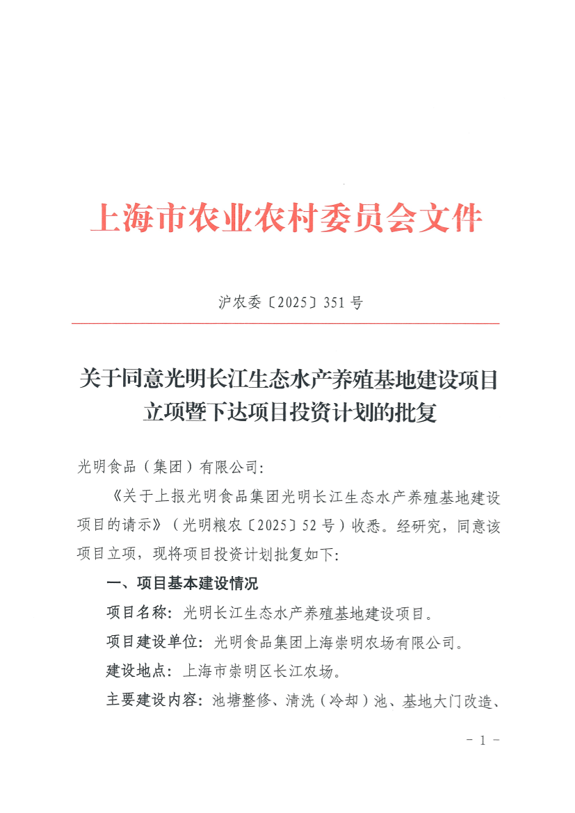 《关于上报光明食品集团光明长江生态水产养殖基地建设项目的请示》(光明粮农〔2025〕52号)收悉。经研究,同意该项目立项,现将项目投资计划批复如下: