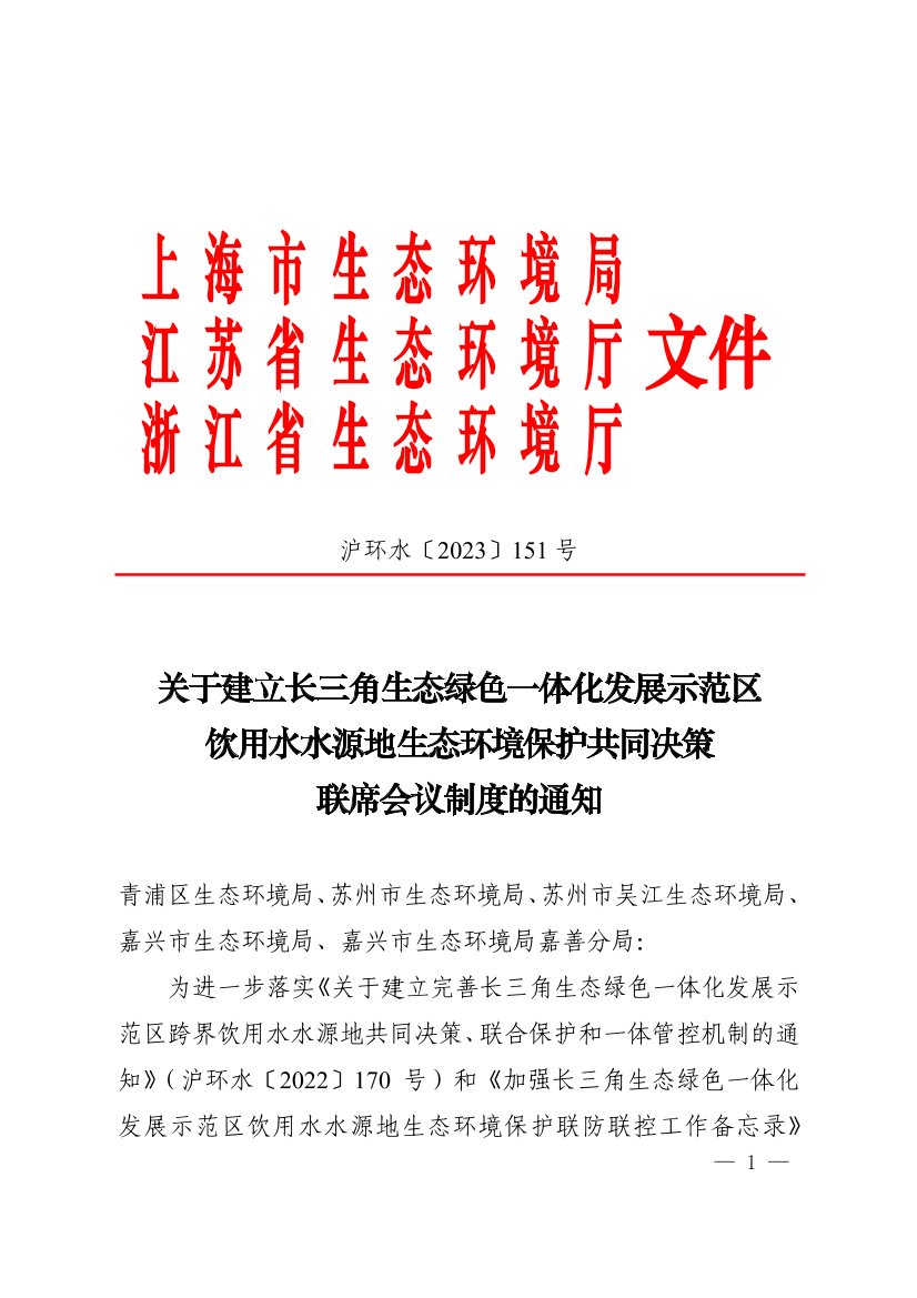为进一步落实《关于建立完善长三角生态绿色一体化发展示范区跨界饮用水水源地共同决策、联合保护和一体管控机制的通知》(沪环水〔2022〕170号)和《加强长三角生态绿色一体化发展示范区饮用水水源地生态环境保护联防联控工作备忘录》《沪苏交界地区跨界河湖共保联治备忘录》等有关工作要求,建立完善共同决策和协调合作机制,共同推进示范区跨界饮用水水源地生态环境保护,按照一体化和“一盘棋”的基本原则,建立长三角生态绿色一体化发展示范区饮用水水源地生态环境保护共同决策联席会议制度。