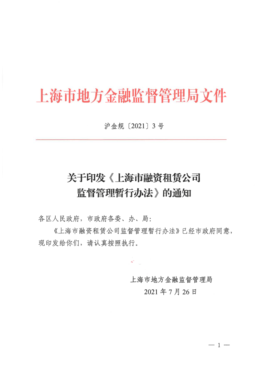 关于印发《上海市融资租赁公司监督管理暂行办法》的通知
