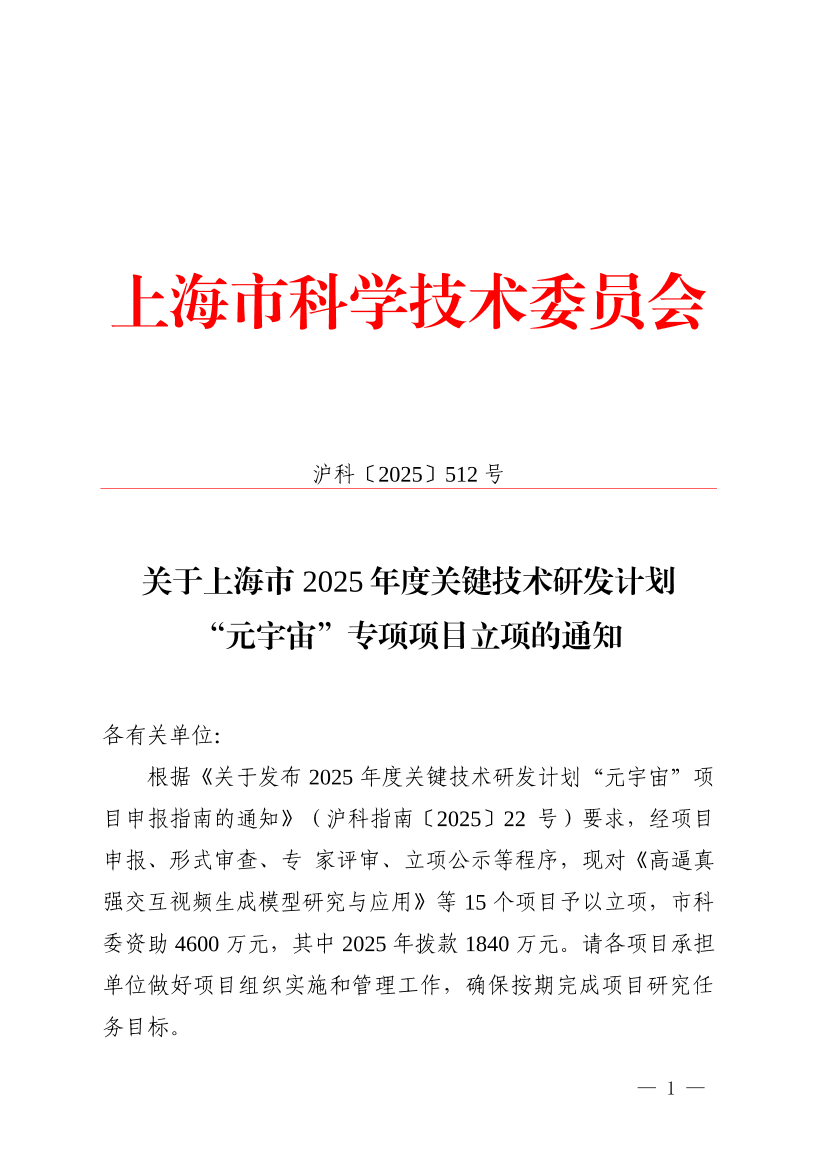 根据《关于发布2025年度关键技术研发计划“元宇宙”项目申报指南的通知》(沪科指南〔2025〕22号)要求,经项目申报、形式审查、专家评审、立项公示等程序,现对《高逼真强交互视频生成模型研究与应用》等15个项目予以立项,市科委资助4600万元,其中2025年拨款1840万元。请各项目承担单位做好项目组织实施和管理工作,确保按期完成项目研究任务目标。