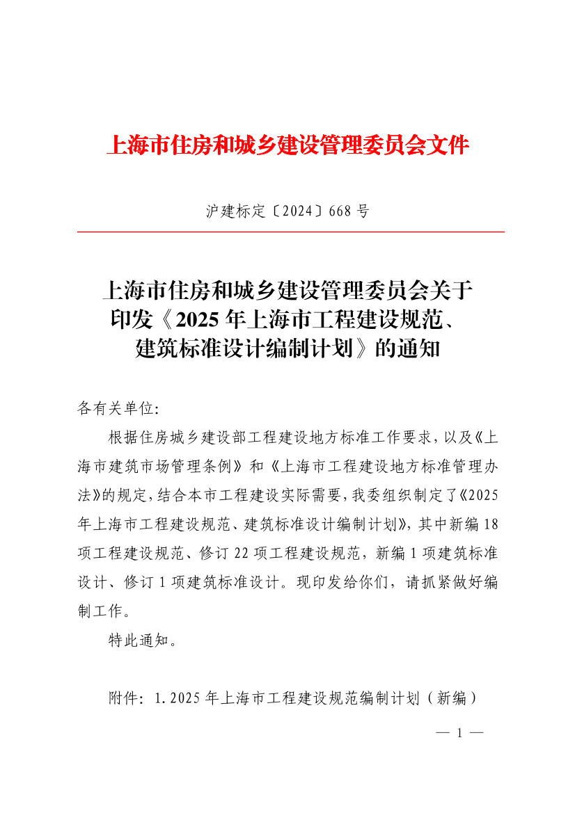 关于印发《2025年上海市工程建设规范、建筑标准设计编制计划》的通知