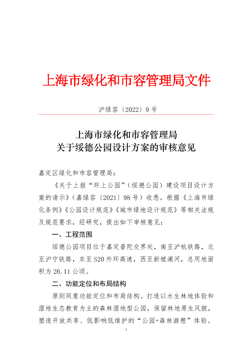 《关于上报“环上公园”(绥德公园)建设项目设计方案的请示》(嘉绿容〔2021〕98号)收悉。根据《上海市绿化条例》《公园设计规范》《城市绿地设计规范》等相关法规及规范要求,经研究,提出如下审核意见: