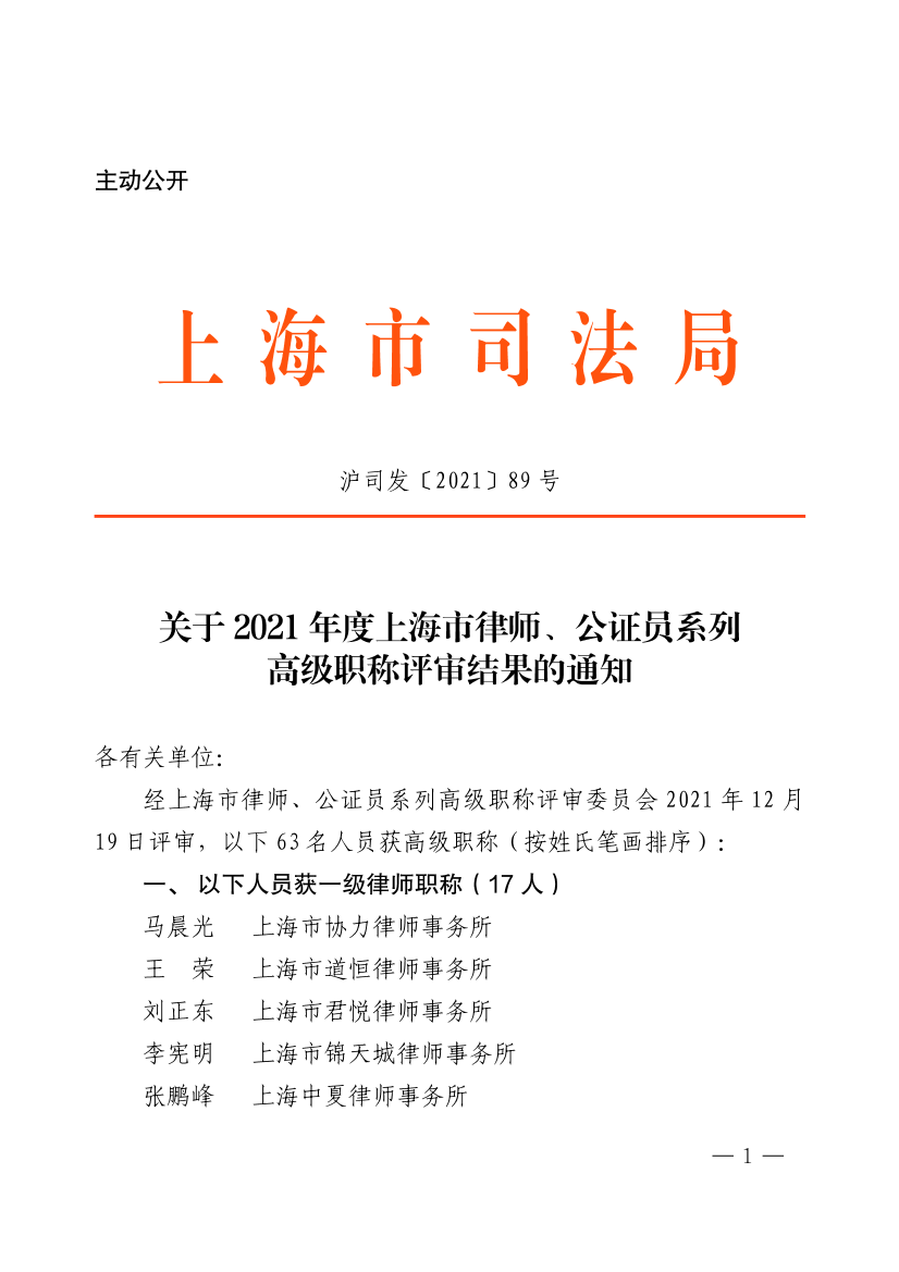 经上海市律师、公证员系列高级职称评审委员会2021年12月19日评审,以下63名人员获高级职称(按姓氏笔画排序):