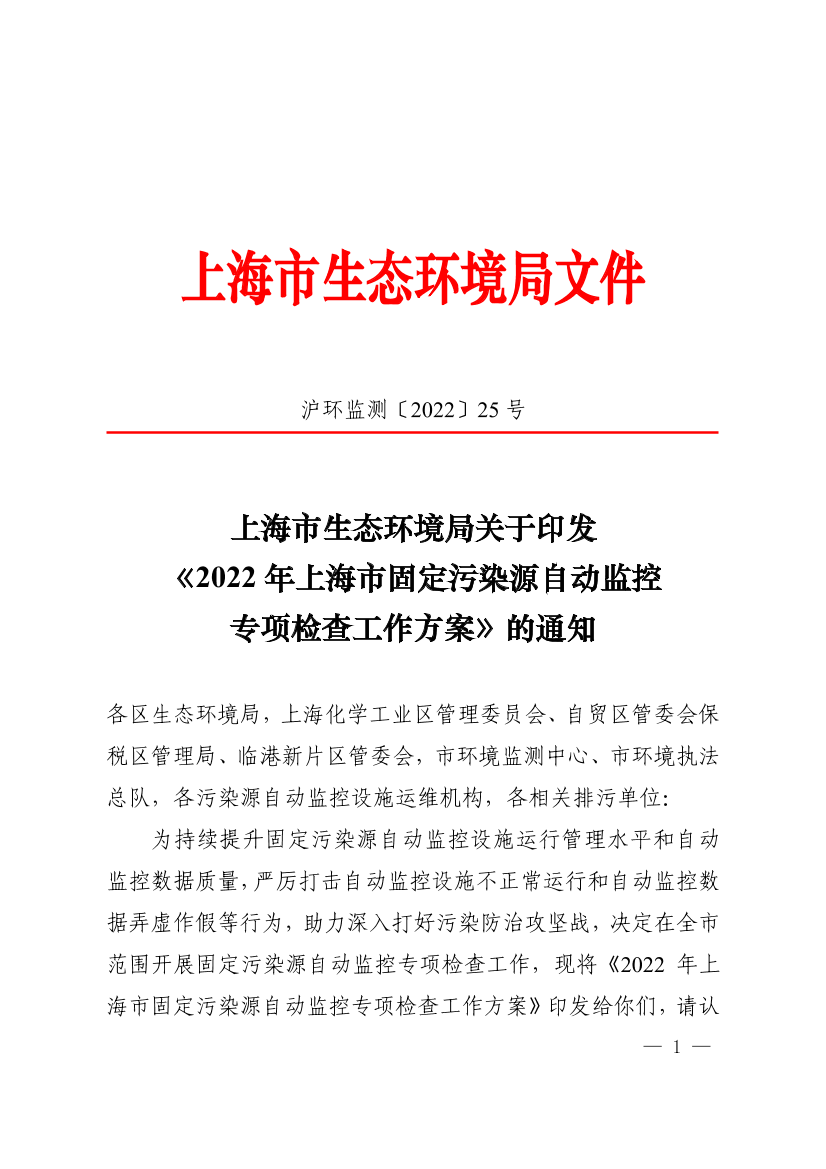 2022年上海市固定污染源自动监控专项检查工作方案