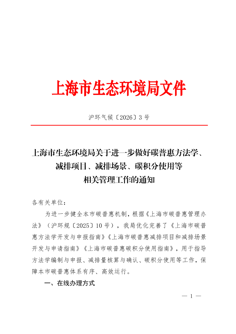 为进一步健全本市碳普惠机制,根据《上海市碳普惠管理办法》(沪环规〔2025〕10号),我局优化完善了《上海市碳普惠方法学开发与申报指南》《上海市碳普惠减排项目和减排场景开发与申请指南》《上海市碳普惠碳积分使用指南》,用于指导方法学编制与申报、减排量核算与确认、碳积分使用等工作,保障本市碳普惠体系有序、高效运行。