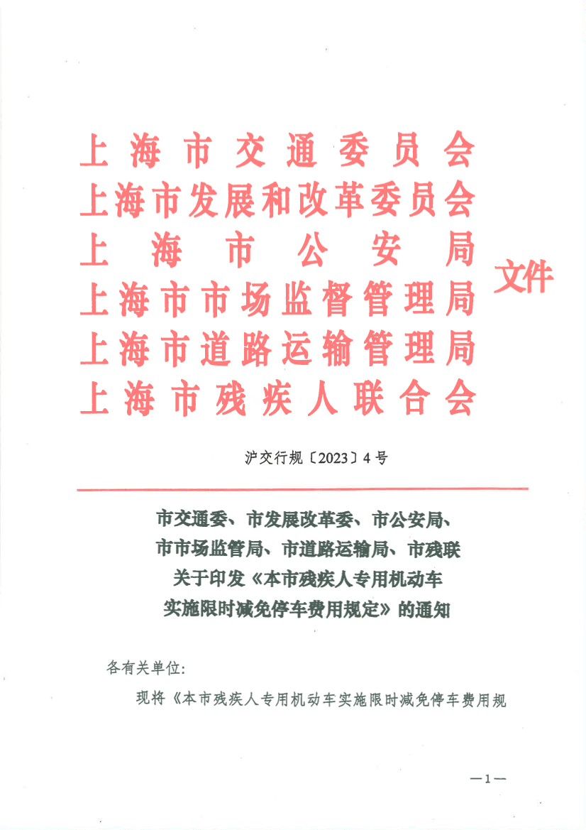 为方便本市残疾人交通出行,提升残疾人公共服务水平,营造尊重、理解、关心、帮助残疾人的良好氛围,根据《上海市无障碍环境建设条例》《上海市无障碍环境建设与管理办法》等有关规定,现就本市残疾人专用机动车实施限时减免停车费用事项规定如下: