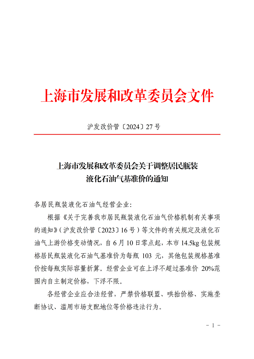 根据《关于完善我市居民瓶装液化石油气价格机制有关事项的通知》(沪发改价管〔2023〕16号)等文件的有关规定及液化石油气上游价格变动情况,自6月10日零点起,本市14.5kg包装规格居民瓶装液化石油气基准价为每瓶103元,其他包装规格基准价按每瓶实际容量折算。经营企业可在上浮不超过基准价20%范围内自主制定价格,下浮不限。