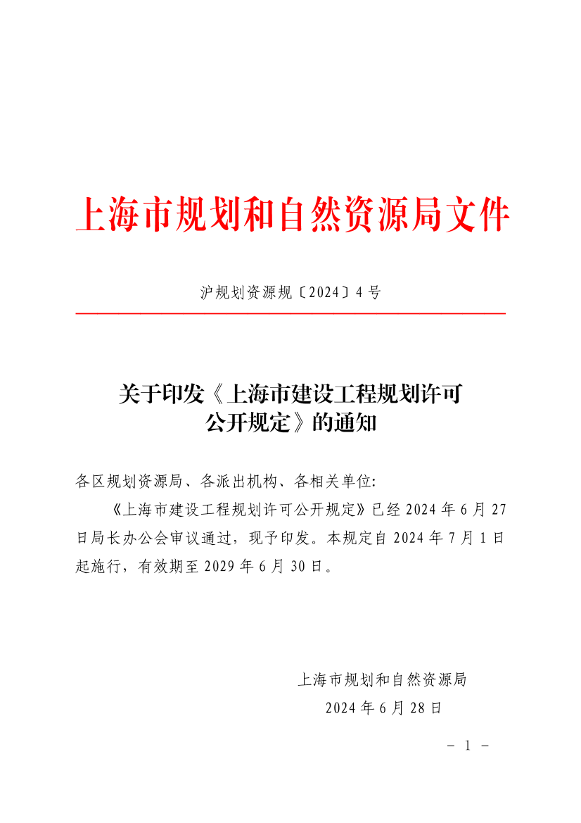 《上海市建设工程规划许可公开规定》已经2024年6月27日局长办公会审议通过,现予印发。本规定自2024年7月1日起施行,有效期至2029年6月30日。