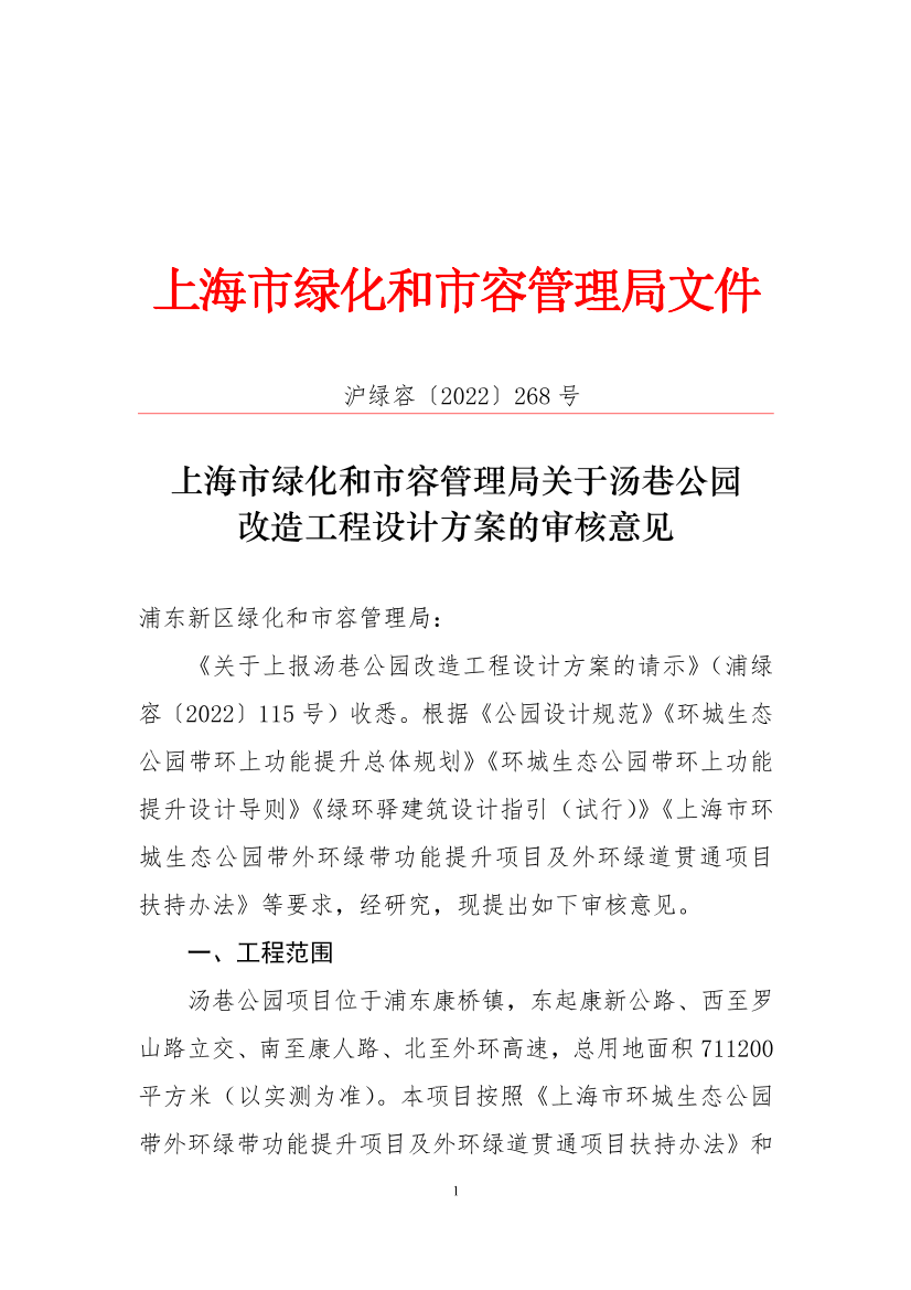 《关于上报汤巷公园改造工程设计方案的请示》(浦绿容〔2022〕115号)收悉。根据《公园设计规范》《环城生态公园带环上功能提升总体规划》《环城生态公园带环上功能提升设计导则》《绿环驿建筑设计指引(试行)》《上海市环城生态公园带外环绿带功能提升项目及外环绿道贯通项目扶持办法》等要求,经研究,现提出如下审核意见。
