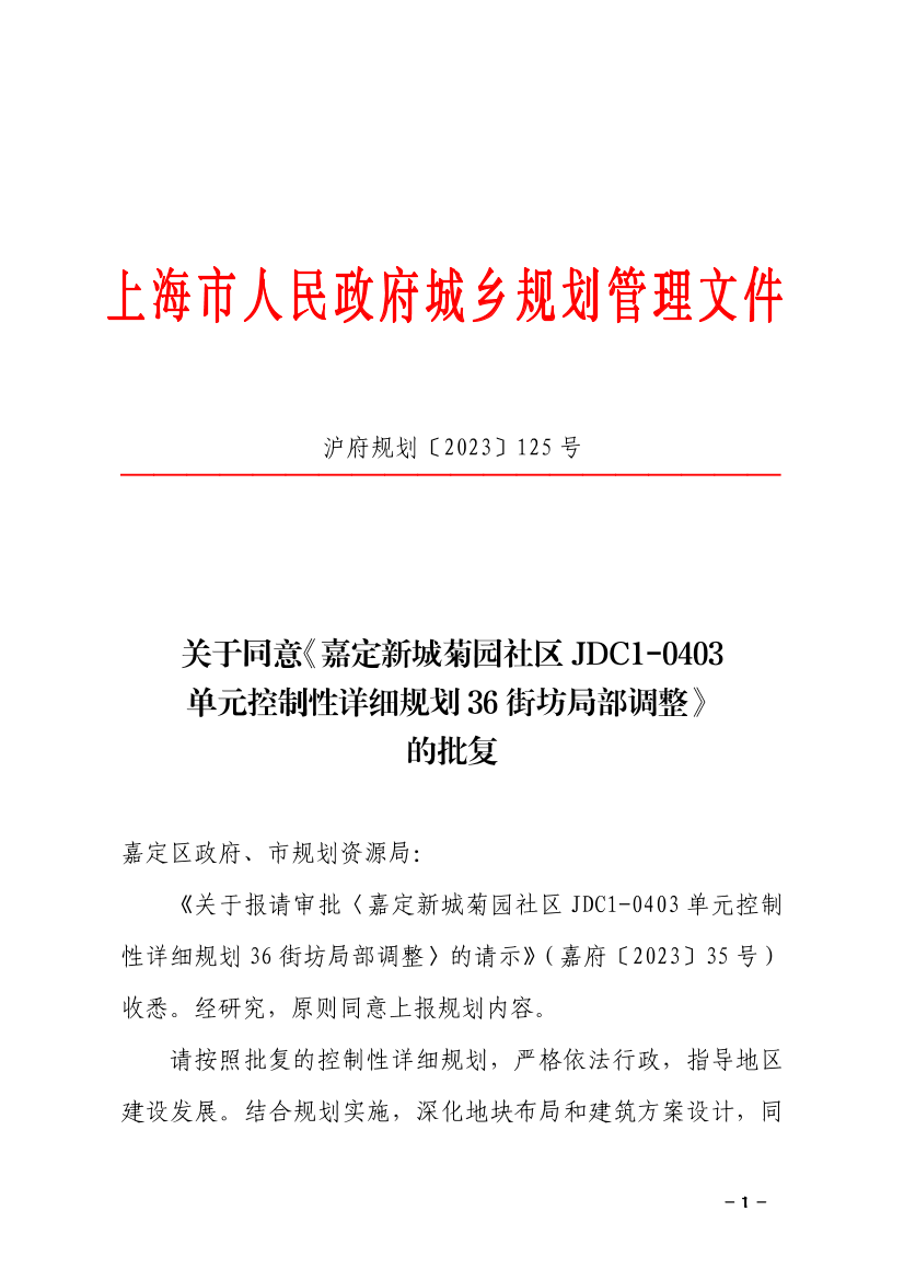 《关于报请审批〈嘉定新城菊园社区JDC1-0403单元控制性详细规划36街坊局部调整〉的请示》(嘉府〔2023〕35号)收悉。经研究,原则同意上报规划内容。