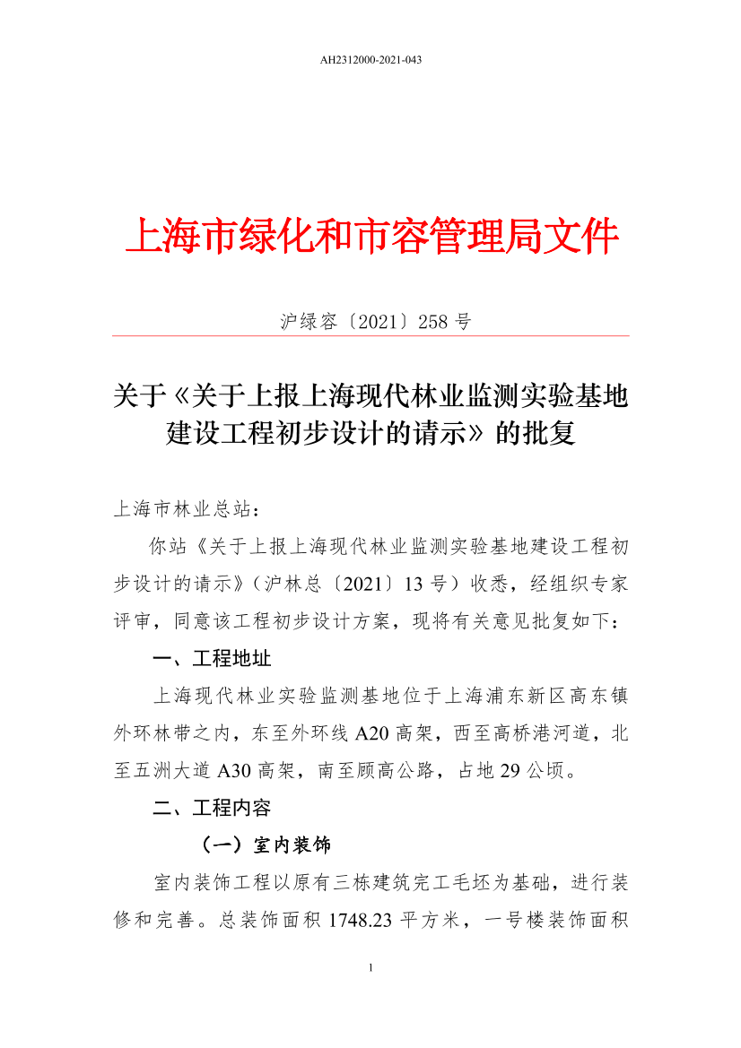 你站《关于上报上海现代林业监测实验基地建设工程初步设计的请示》(沪林总〔2021〕13号)收悉,经组织专家评审,同意该工程初步设计方案,现将有关意见批复如下: