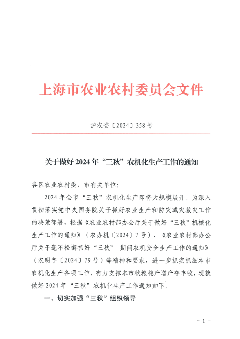 2024年全市“三秋”农机化生产即将大规模展开。为深入贯彻落实党中央国务院关于抓好农业生产和防灾减灾救灾工作的决策部署,根据《农业农村部办公厅关于做好“三秋”机械化生产工作的通知》(农办机〔2024〕7号)、《农业农村部办公厅关于毫不松懈抓好“三秋” 期间农机安全生产工作的通知》(农明字〔2024〕79号)等精神和要求,进一步抓实抓细本市农机化生产各项工作,有力支撑本市秋粮稳产增产夺丰收,现就做好2024年“三秋”农机化生产工作通知如下。