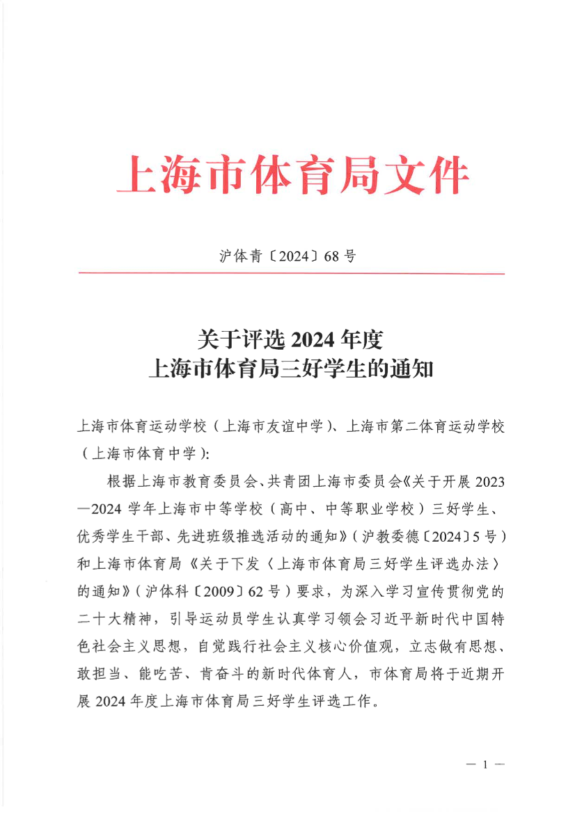 根据上海市教育委员会、共青团上海市委员会《关于开展2023—2024学年上海市中等学校(高中、中等职业学校)三好学生、优秀学生干部、先进班级推选活动的通知》(沪教委德〔2024〕5号)和上海市体育局《关于下发〈上海市体育局三好学生评选办法〉的通知》(沪体科〔2009〕62号)要求,为深入学习宣传贯彻党的二十大精神,引导运动员学生认真学习领会习近平新时代中国特色社会主义思想,自觉践行社会主义核心价值观,立志做有思想、敢担当、能吃苦、肯奋斗的新时代体育人,市体育局将于近期开展2024年度上海市体育局三好学生评选工作。