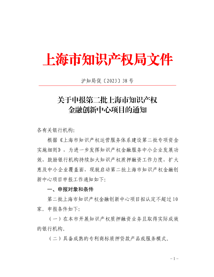 根据《上海市知识产权运营服务体系建设第二批专项资金实施细则》,为进一步发挥知识产权金融服务中小企业发展功效,鼓励银行机构持续加大知识产权质押融资工作力度,扩大惠及中小企业覆盖面,现就启动第二批上海市知识产权金融创新中心项目申报工作通知如下: