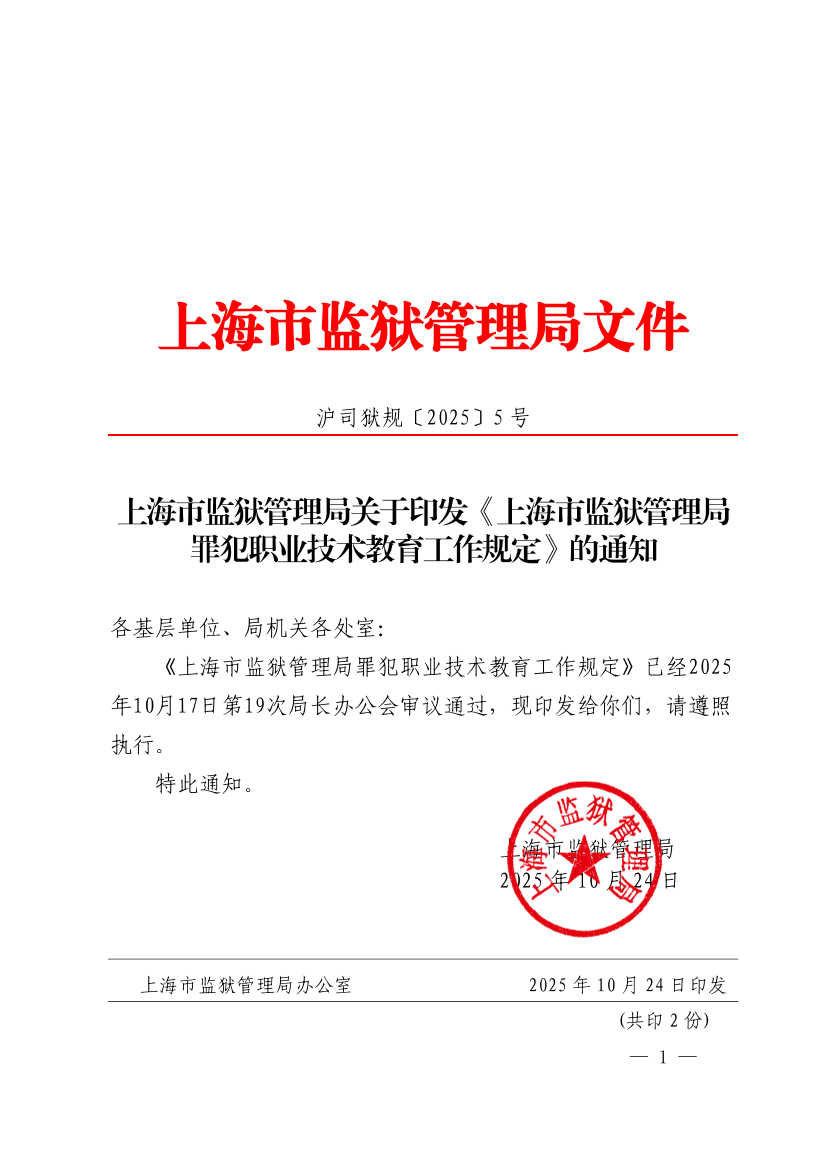 《上海市监狱管理局罪犯职业技术教育工作规定》已经2025年10月17日第19次局长办公会审议通过,现印发给你们,请遵照执行。