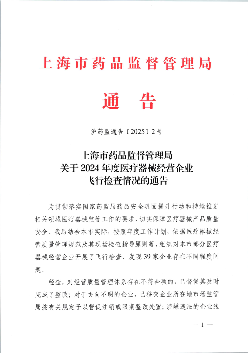 为贯彻落实国家药监局药品安全巩固提升行动和持续推进相关领域医疗器械监管工作的要求,切实保障医疗器械产品质量安全,我局结合本市实际,按照年度工作计划,依据医疗器械经营质量管理规范及其现场检查指导原则等,组织对本市部分医疗器械经营企业开展了飞行检查,发现39家企业存在不同程度问题。