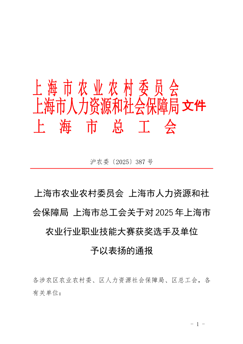 为深入贯彻习近平总书记关于技能人才工作和技能竞赛工作的重要指示精神,全面落实上海市技能人才战略部署,充分发挥职业技能竞赛“以赛促学、以赛促训、以赛促评、以赛促建”的平台作用,大力弘扬劳模精神、劳动精神、工匠精神,加快推进本市农业高技能人才队伍建设,助力乡村振兴战略深入实施,本市于9月至11月举办了2025年上海市农业行业职业技能大赛。根据《上海市农业农村委员会、上海市人力资源和社会保障局、上海市总工会关于举办2025年上海市农业行业职业技能大赛的通知》(沪农委〔2025〕228号)的相关要求,现决定对参赛获奖选手及单位予以通报表扬。具体如下: