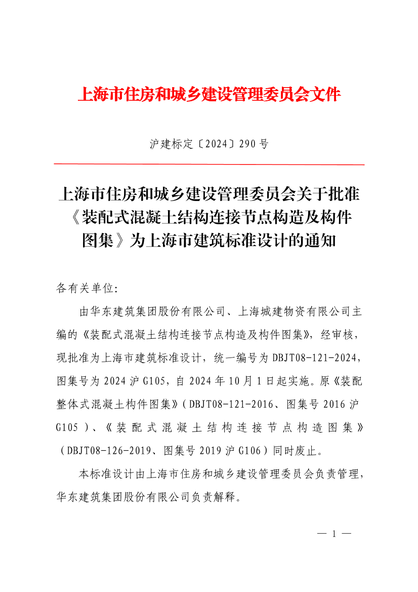 由华东建筑集团股份有限公司、上海城建物资有限公司主编的《装配式混凝土结构连接节点构造及构件图集》,经审核,现批准为上海市建筑标准设计,统一编号为DBJT08-121-2024,图集号为2024沪G105,自2024年10月1日起实施。原《装配整体式混凝土构件图集》(DBJT08-121-2016、图集号2016沪G105)、《装配式混凝土结构连接节点构造图集》(DBJT08-126-2019、图集号2019沪G106)同时废止。