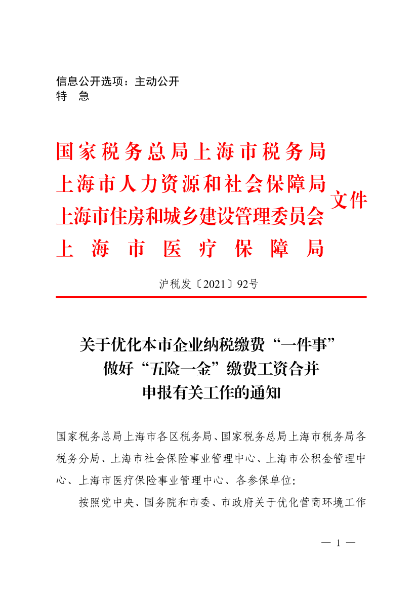 按照党中央、国务院和市委、市政府关于优化营商环境工作部署,为进一步优化本市税收营商环境,提升企业纳税缴费便利度,现就本市优化企业纳税缴费“一件事”,做好“五险一金”缴费工资合并申报有关工作通知如下。