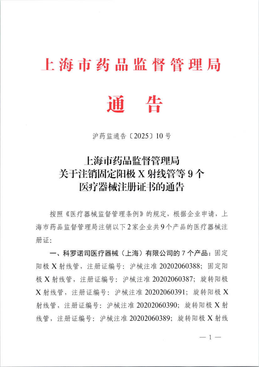 一、科罗诺司医疗器械(上海)有限公司的7个产品:固定阳极X射线管,注册证编号:沪械注准20202060388;固定阳极X射线管,注册证编号:沪械注准20202060387;旋转阳极X射线管,注册证编号:沪械注准20202060391;旋转阳极X射线管,注册证编号:沪械注准20202060390;旋转阳极X射线管,注册证编号:沪械注准20202060389;旋转阳极X射线管,注册证编号:沪械注准20202060369;旋转阳极X射线管,注册证编号:沪械注准20202060370。