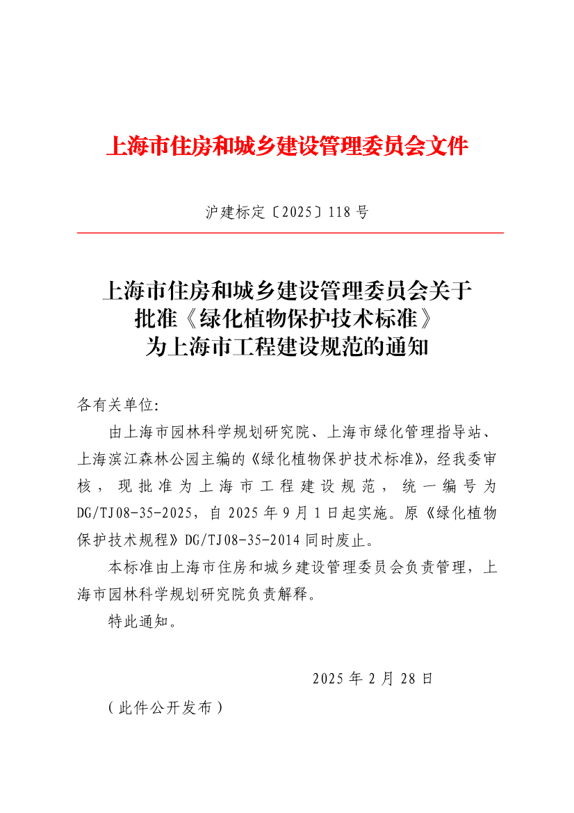 由上海市园林科学规划研究院、上海市绿化管理指导站、上海滨江森林公园主编的《绿化植物保护技术标准》,经我委审核,现批准为上海市工程建设规范,统一编号为DG/TJ08-35-2025,自2025年9月1日起实施。原《绿化植物保护技术规程》DG/TJ08-35-2014同时废止。