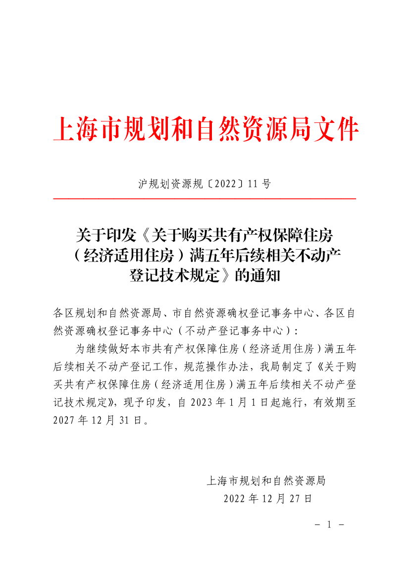 为继续做好本市共有产权保障住房(经济适用住房)满五年后续相关不动产登记工作,规范操作办法,我局制定了《关于购买共有产权保障住房(经济适用住房)满五年后续相关不动产登记技术规定》,现予印发,自2023年1月1日起施行,有效期至2027年12月31日。
