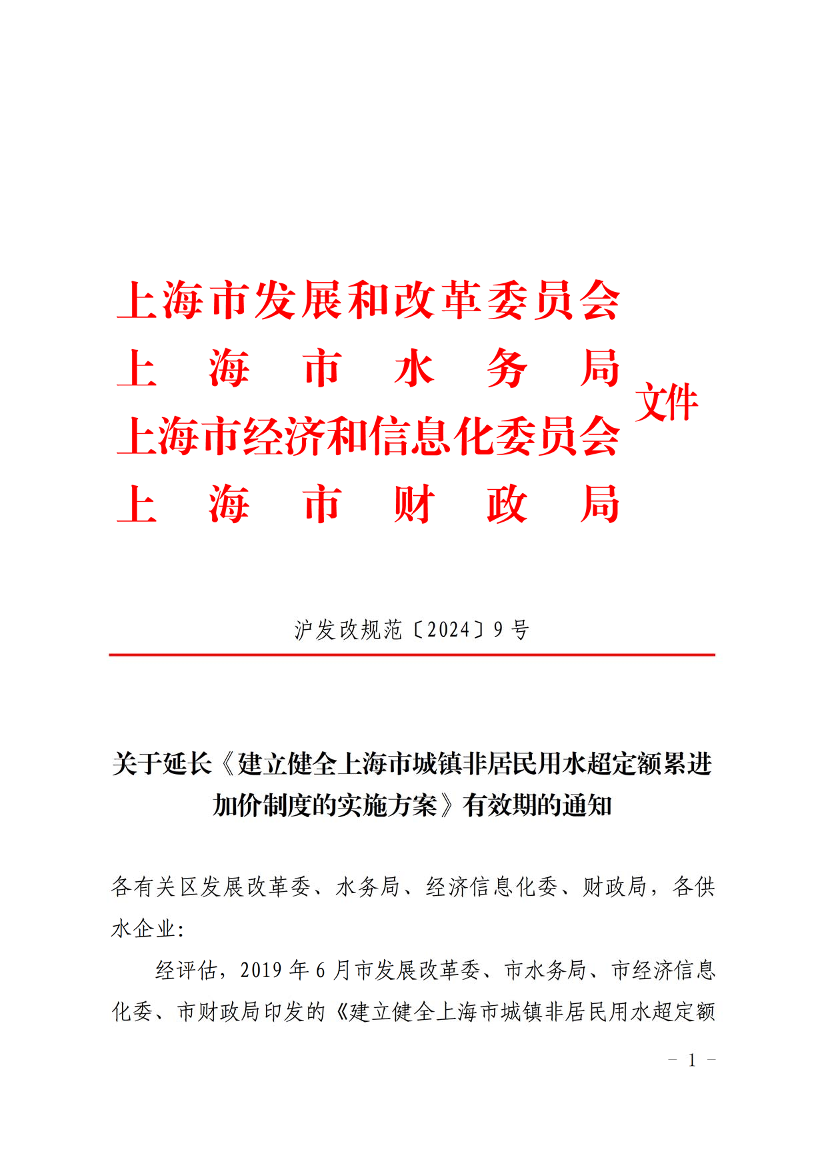 经评估,2019年6月市发展改革委、市水务局、市经济信息化委、市财政局印发的《建立健全上海市城镇非居民用水超定额累进加价制度的实施方案》(沪发改规范﹝2019﹞9号)需继续实施,有效期延长至2029年7月31日。