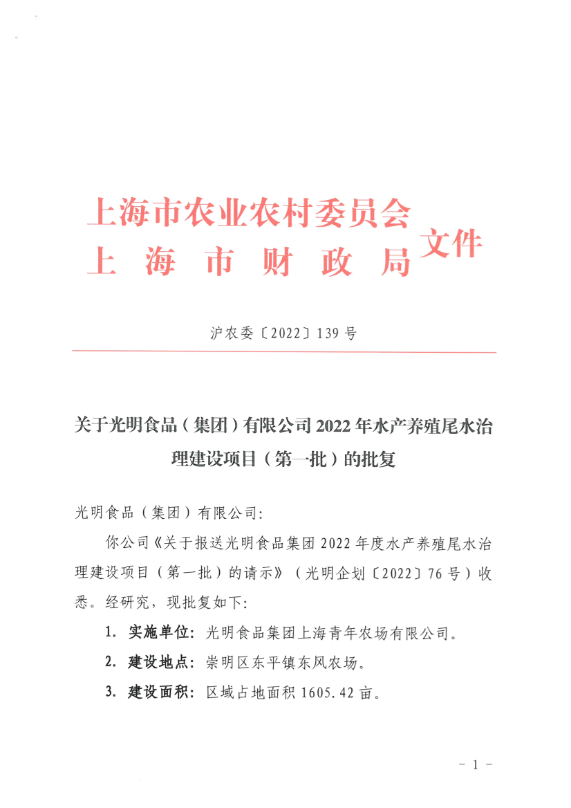 你公司《关于报送光明食品集团2022年度水产养殖尾水治理建设项目(第一批)的请示》(光明企划〔2022〕76号)收悉。经研究,现批复如下: