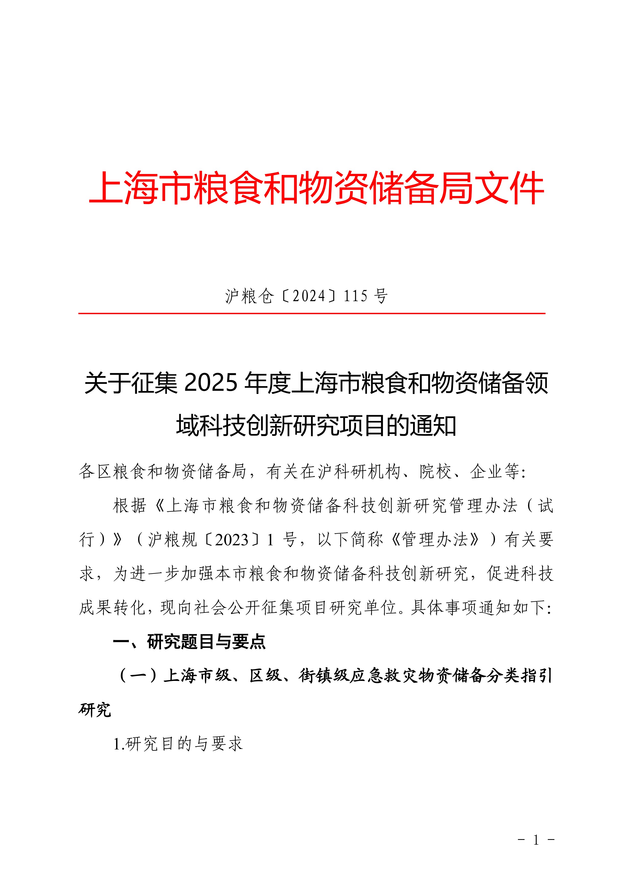 根据《上海市粮食和物资储备科技创新研究管理办法(试行)》(沪粮规〔2023〕1号,以下简称《管理办法》)有关要求,为进一步加强本市粮食和物资储备科技创新研究,促进科技成果转化,现向社会公开征集项目研究单位。具体事项通知如下: